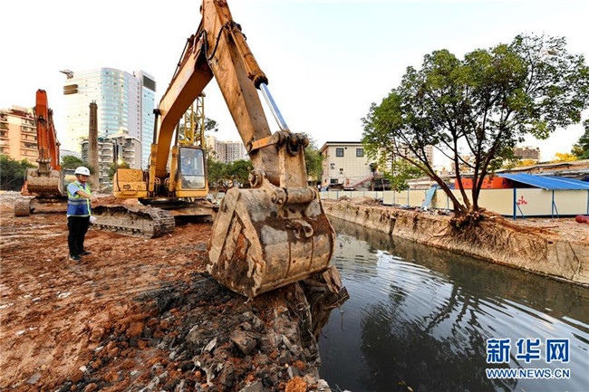 福建省福州市鼓臺中心區(qū)水系綜合治理點(diǎn)達(dá)道河河長溫水林在指揮工人進(jìn)行河道新建截污管的回填(2017年10月11日攝)。