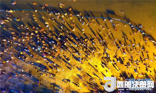 7月18日,市民在廣西柳州市金沙角人工沙灘上戲水消暑(無人機拍攝)。