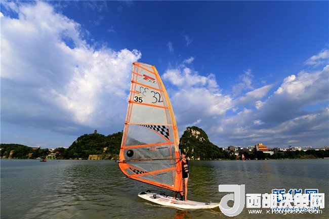 7月18日,在廣西柳州市金沙角水域,一名帆板愛好者在江面上練習帆板。