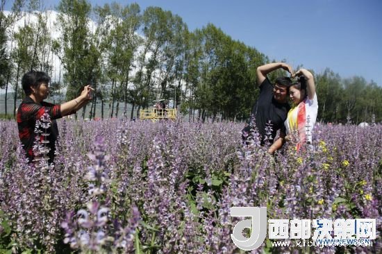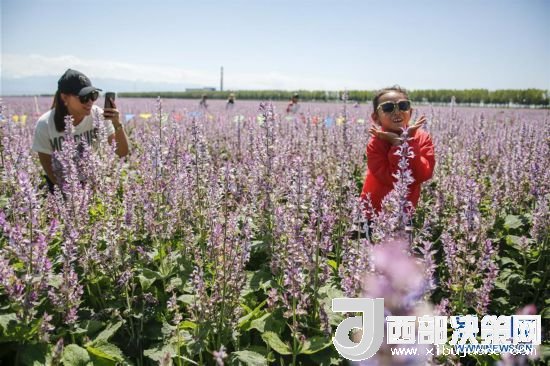 8月1日,來自新疆霍爾果斯的游客在新疆昭蘇縣一處香紫蘇花海景區(qū)拍照留影。新華社記者黃臻攝