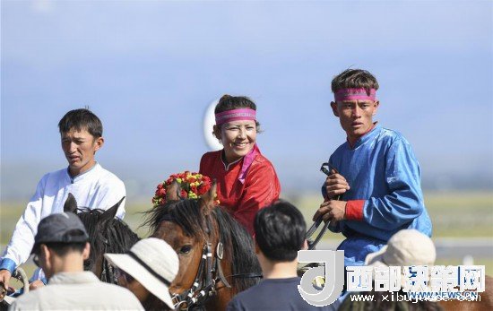 8月1日,在新疆昭蘇縣天馬旅游文化產(chǎn)業(yè)園,肯巴提·買達力(中)和游客在互動。今年5月,她參加了馬術(shù)表演隊,每月收入2000元左右。新華社記者胡虎虎攝