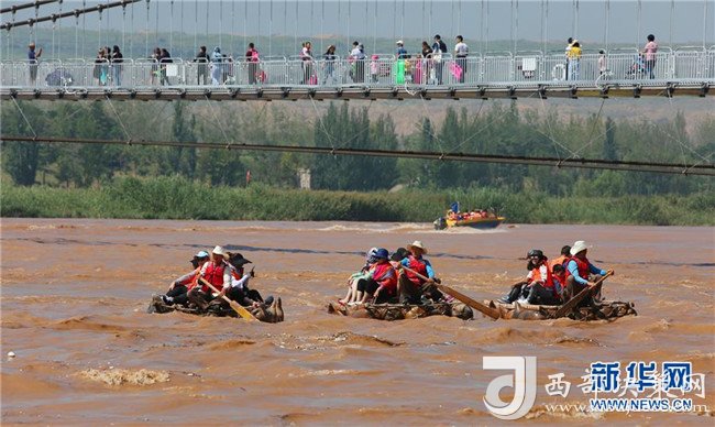 8月22日,游客在中衛(wèi)市沙坡頭旅游景區(qū)乘坐羊皮筏子游覽。沙坡頭旅游景區(qū)因地制宜發(fā)展沙漠旅游,旺季日接待游客量達兩萬人次。新華社記者伍婧丹攝