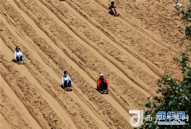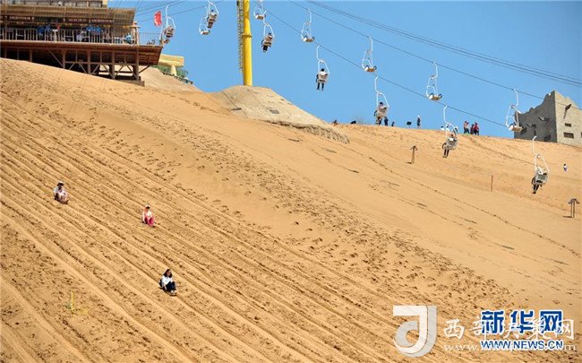 8月22日,游客在中衛(wèi)市沙坡頭旅游景區(qū)體驗滑沙。沙坡頭旅游景區(qū)因地制宜發(fā)展沙漠旅游,旺季日接待游客量達兩萬人次。新華社記者伍婧丹攝