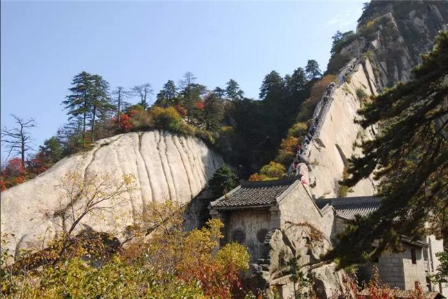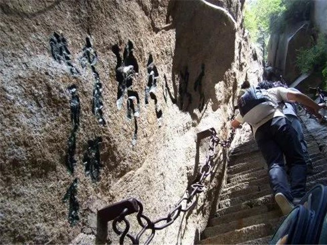 蒼龍嶺是華山著名險道之一,其位于救苦臺南、五云峰下,以其蒼黑色的外部和其似懸龍般的地勢而得名。其如履薄刃,絕壑千尺的地勢使得很多游客膽戰(zhàn)心驚,其中最著名的就是韓愈大哭投書求助的故事并引發(fā)了大量的相關典故和考證,而該處也因此留下了“韓退之投書處”的文化遺產。