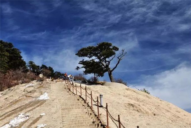 登西峰極目遠眺,四周群山起伏,云霞四披,周野屏開,黃渭曲流,置身其中若入仙鄉(xiāng)神府,萬種俗念,一掃而空。宋名隱士陳摶在他的《西峰》詩中就有"寄言嘉遁客,此處是仙鄉(xiāng)"的名句。西峰南崖有山脊與南峰相連,脊長300余米,石色蒼黛,形態(tài)好象一條屈縮的巨龍,人稱為屈嶺,也稱小蒼龍嶺,是華山著名的險道之一。