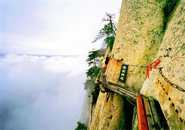 長空棧道是華山險道中的險中之險。古往今來,歷險探勝者絡繹不絕,其中不乏文士名流,多有記述傳世。明代“后七子”之一的李攀龍《太華山記》記述:“出南天門向西就是棧道,棧雖有銅柱鐵索攔護,然闊不盈尺。行二十余丈方至盡頭。下折為井,高約三丈,旁出復為棧。”