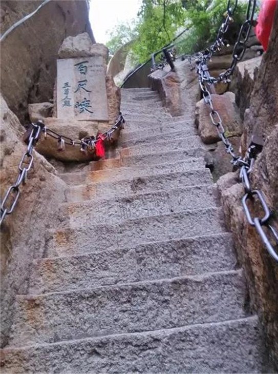 千尺幢位于回心石之上,是華山第一險境。山幢壁直立,其間僅容二人上下穿行。兩邊鐵鏈垂直下垂,坡度為70°。從上到下共有370多個臺階,皆不滿足寬。