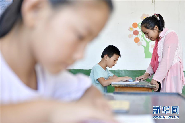 9月9日,崔芳英老師在為兩名學(xué)生上數(shù)學(xué)課。新華社記者 朱旭東 攝