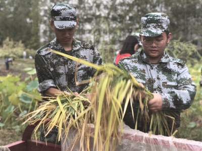 據(jù)介紹,川大錦城這一片金燦燦的稻谷于今年4月栽種,經(jīng)過了幾個(gè)月生長(zhǎng),迎來(lái)了大豐收,“這是我們自己種的,現(xiàn)在自己來(lái)收割,感覺特別有意義。”結(jié)束了上午軍訓(xùn)的大一學(xué)生也來(lái)到了現(xiàn)場(chǎng),幫忙打谷子。