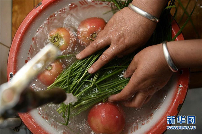 在中寧縣喊叫水鄉(xiāng)賀家口子村,村民金風(fēng)花在洗菜(9月6日攝)。新華社記者 王鵬 攝