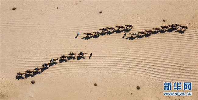 游客騎著駱駝在寧夏石嘴山市平羅縣沙湖景區(qū)觀光旅游(9月12日無(wú)人機(jī)拍攝)。 寧夏,地處中國(guó)西北腹地。這里的大山、大河、草原、沙漠、湖泊,猶如一幅幅美妙畫卷,讓人流連忘返。 新華社記者 王建華 攝