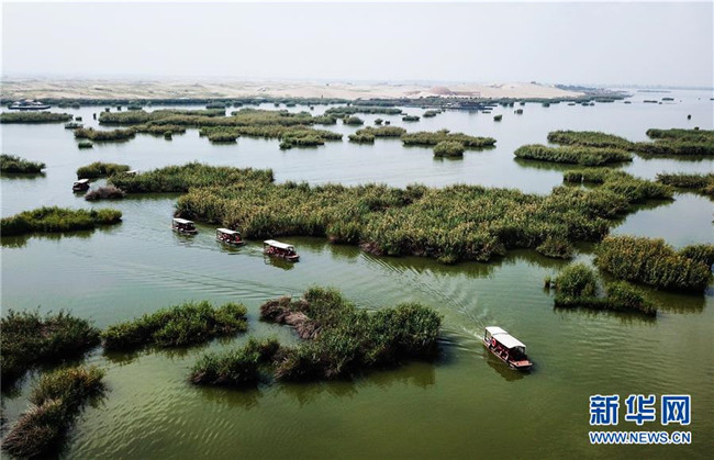 游客乘船在寧夏石嘴山市平羅縣沙湖景區(qū)游玩(9月12日無(wú)人機(jī)拍攝)。 寧夏,地處中國(guó)西北腹地。這里的大山、大河、草原、沙漠、湖泊,猶如一幅幅美妙畫卷,讓人流連忘返。 新華社記者 陳斌 攝