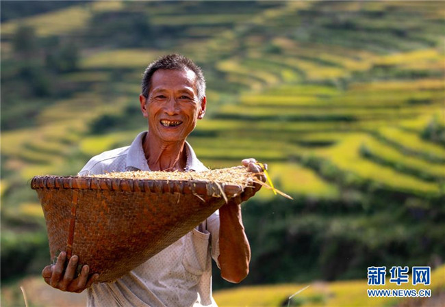 9月19日,花田鄉(xiāng)何家?guī)r村村民冉紅兵端著裝滿稻谷的簸箕。