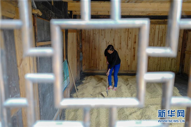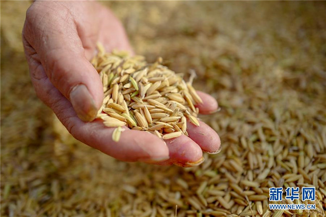花田鄉(xiāng)何家?guī)r村村民收獲的稻米(9月19日攝)。記者劉潺攝