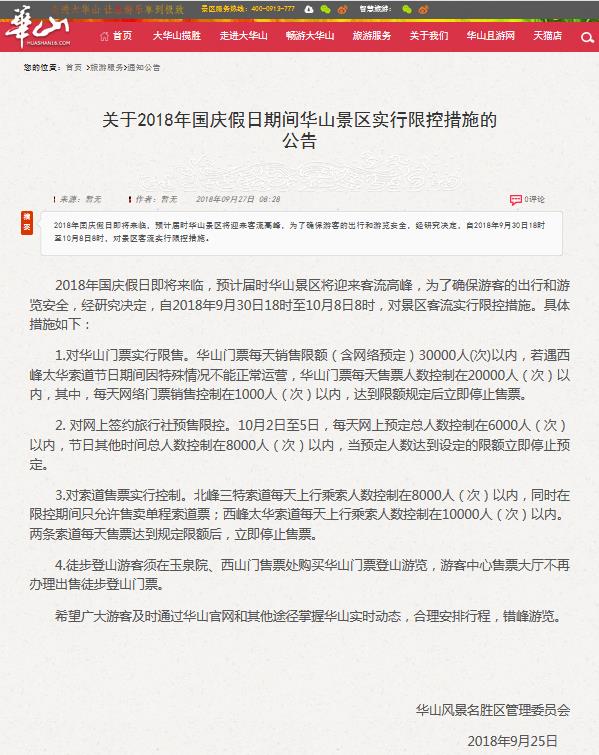 2018年國慶假日即將來臨,預計屆時華山景區(qū)將迎來客流高峰,為了確保游客的出行和游覽安全,經(jīng)研究決定,自2018年9月30日18時至10月8日8時,對景區(qū)客流實行限控措施。具體措施如下: