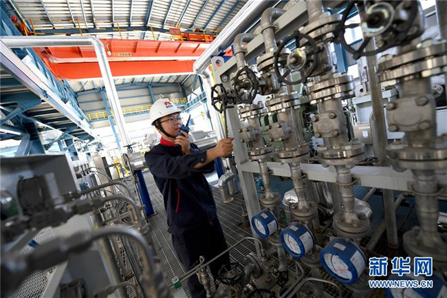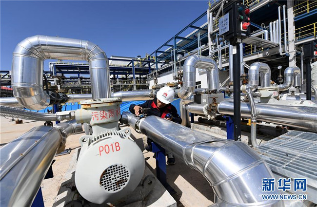 延安煤油氣資源綜合利用項目甲醇制烯烴中心的工作人員在進行設備巡檢(9月28日攝)。新華社記者 劉瀟 攝