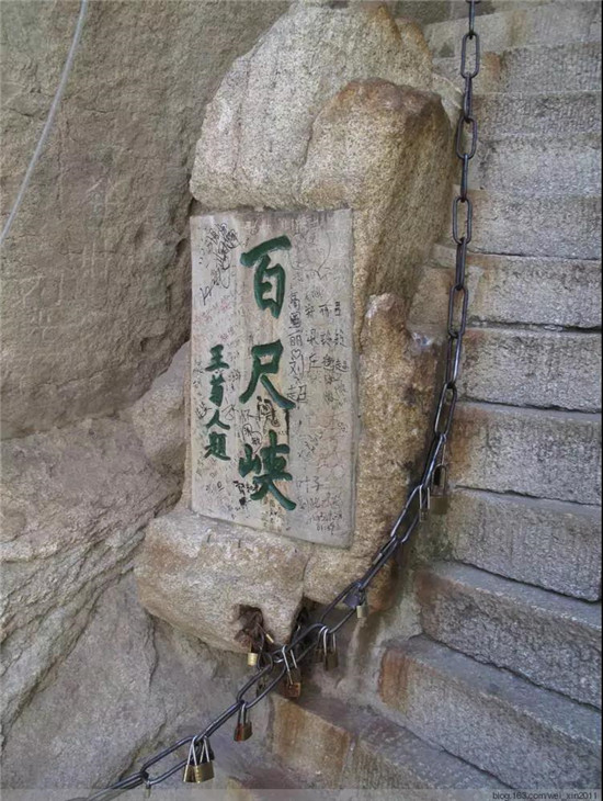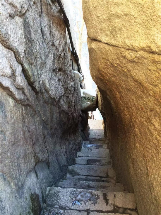 “千尺幢”在華山峪古道“回心石”上,是經(jīng)華山峪登主峰的必經(jīng)之道。這里原為一崖間裂隙,直立70度,后來人們沿隙鑿?fù)爻陕?,有石階370級,階寬僅容半足,游人登臨時,仰視一線天,俯視若臨深井。