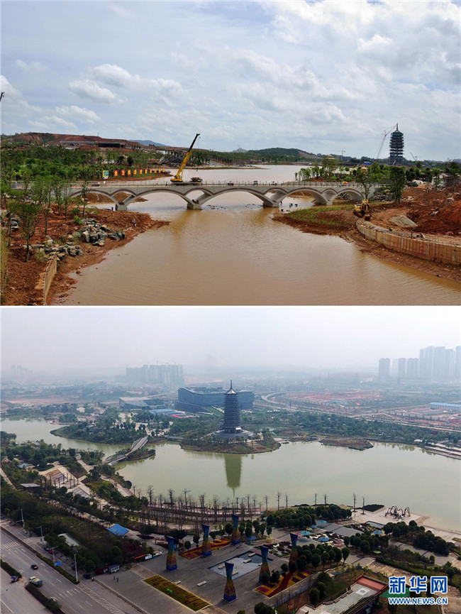 拼版照片。上圖為南寧五象新區(qū)良慶大橋(2016年6月24日,新華社記者 周華 攝);下圖為五象新區(qū)良慶大橋附近景觀(2018年8月8日,劉相初 攝)