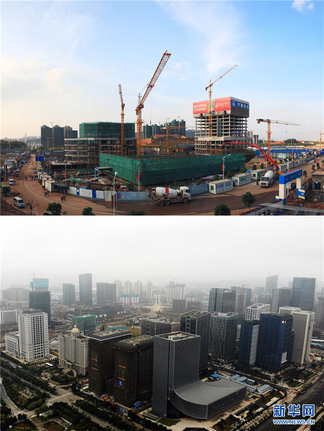拼版照片。上圖為建設(shè)中的五象新區(qū)總部基地(2014年7月8日,譚毅 攝);下圖為無人機航拍的五象新區(qū)總部基地(2018年10月22日,新華網(wǎng) 章佳禮 攝)