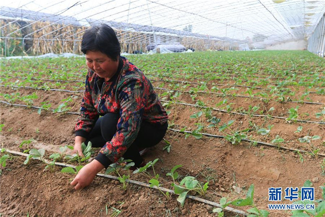 山東沂水縣龍家圈街道寨里社區(qū)居民在草莓大棚內(nèi)勞作(10月9日攝)。這里是由扶貧資金投資建設(shè)的草莓種植基地,也是山東臨沂“四權(quán)分置”扶貧新模式的“試驗(yàn)田”。新華社記者 王南 攝