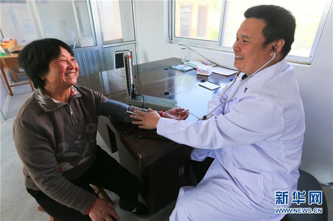 在山東蒙陰縣云夢湖生態(tài)區(qū)東汶社區(qū)的農(nóng)村幸福院養(yǎng)老院的醫(yī)務(wù)室,醫(yī)生為老人測量血壓(10月11日攝)。2016年,東汶社區(qū)將原來的村兩委大院擴(kuò)建為農(nóng)村幸福院養(yǎng)老院,委派專人負(fù)責(zé)老人們的一日三餐。同時(shí)按照“子女交納、集體補(bǔ)助、社會(huì)捐贈(zèng)、財(cái)政獎(jiǎng)勵(lì)”的模式設(shè)立孝心養(yǎng)老基金,每月定時(shí)發(fā)給貧困老人。新華社記者 王南 攝