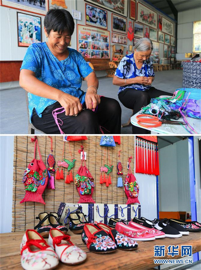 拼版照片(8月22日攝):上圖在山東費(fèi)縣朱田鎮(zhèn)崔家溝社區(qū)的居家靈活就業(yè)培訓(xùn)中心,當(dāng)?shù)卮迕裨诳p制手工飾品;下圖當(dāng)?shù)卮迕窨p制的手工飾品和布鞋(8月22日攝)。崔家溝村是遠(yuǎn)近聞名的“光棍村”“貧困村中的貧困村”。2016年3月,崔家溝村在中央異地搬遷政策的扶持下,實(shí)現(xiàn)了整體搬遷,1600多口人搬到了鎮(zhèn)駐地。從此,昔日的“光棍村”,一躍進(jìn)入朱田鎮(zhèn)富裕村行列。新華社記者 王南 攝