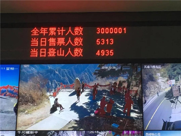 在全國(guó)慶祝改革開放40周年之際,10月29日11時(shí),華山景區(qū)迎來了今年購票登山人數(shù)300萬人次的歷史性時(shí)刻。