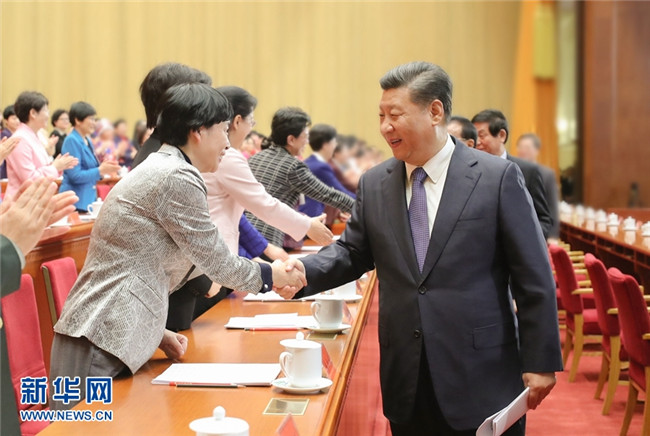10月30日,中國婦女第十二次全國代表大會在北京人民大會堂開幕。這是中共中央總書記、國家主席、中央軍委主席習近平等同與會代表親切握手。 新華社記者 鞠鵬 攝