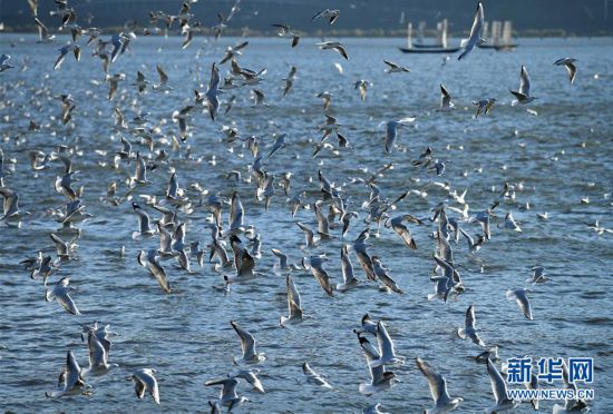 這是11月14日拍攝的在昆明滇池上飛翔的紅嘴鷗?!⌒氯A社記者 藺以光 攝