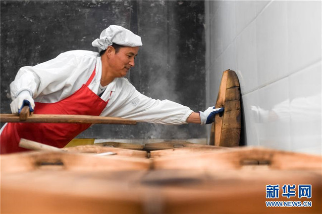 11月22日,姚新花在鍋巴廠里為土灶添柴。 新華社記者 徐亮攝