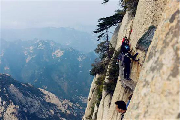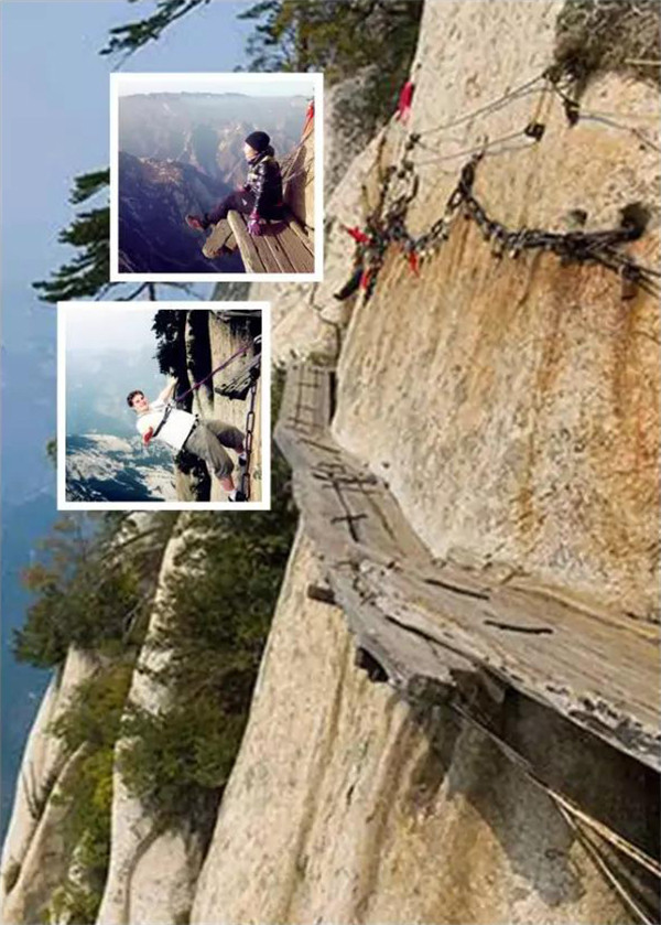 西岳華山歷來(lái)被認(rèn)為是五岳之中最為險(xiǎn)峻的,而在華山中,險(xiǎn)中之險(xiǎn)莫過(guò)于“長(zhǎng)空棧道”和“鷂子翻身”。特別是具有700多年歷史的長(zhǎng)空棧道,在華山南峰東側(cè)山腰的萬(wàn)仞絕壁上鑿出來(lái)的幾個(gè)踏腳之處,鑲嵌石釘搭木椽搭建了一個(gè)百余米懸空的棧道,讓人望而卻步,如果你有恐高癥,僅僅看一眼都會(huì)讓你驚恐萬(wàn)分。2013年,著名旅游網(wǎng)站“Smarter Travel”盤(pán)點(diǎn)全球最恐怖懸崖步道,將華山長(zhǎng)空棧道列為全球十大最恐怖的懸崖步道之一。