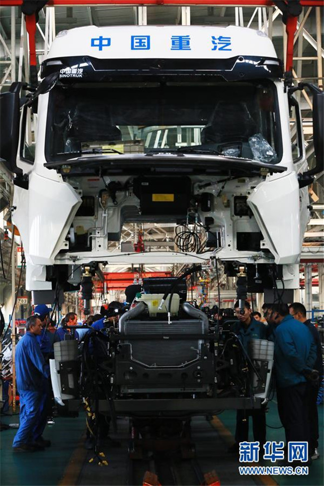 工人在中國重汽集團濟寧商用車總裝生產線上裝配汽車(11月22日攝)。 新華社發(fā)(李明放 攝)