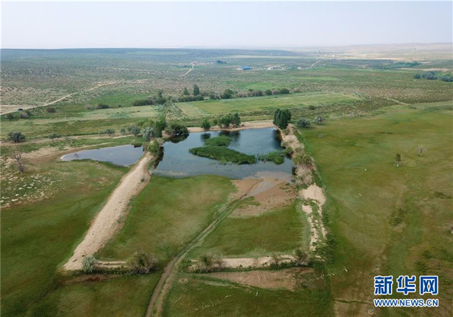 內蒙古杭錦旗沙日召嘎查牧民白音道爾計治理過的庫布其沙漠(7月31日無人機拍攝)。新華社記者邢廣利攝