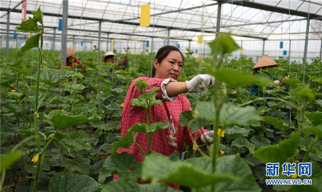在河南新蔡縣磚店鎮(zhèn),一位村民在產業(yè)扶貧基地黃瓜溫棚里勞動(9月10日攝)。新華社發(fā)(宋超喜攝)