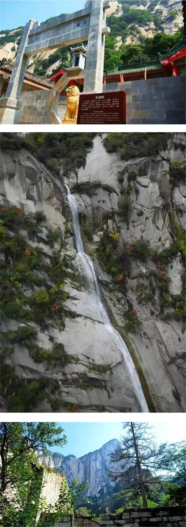 青柯坪背依主峰,絕壁千仞,拔地而起;水簾瀑布,如從云天垂落,跌落谷中,聲如雷霆,主峰由于總是處在逆光和側(cè)逆光中,就象巨靈神剪影緊貼天幕之上。登臨青柯坪,還可眺望秦川,那種感覺就如從洞天俯視塵寰。四周峰巒環(huán)繞,林木蔥郁,山寺石洞,掩映其間,這里就是華山風(fēng)水的結(jié)穴處。我們現(xiàn)在所處的是西道院又名紫云宮,這里供奉的是“三霄”娘娘,為道教送子神。明朝時(shí)為太華書院,名儒馮從吾坐館任教,著書立說,從學(xué)者三百,可想當(dāng)時(shí)的盛況。
