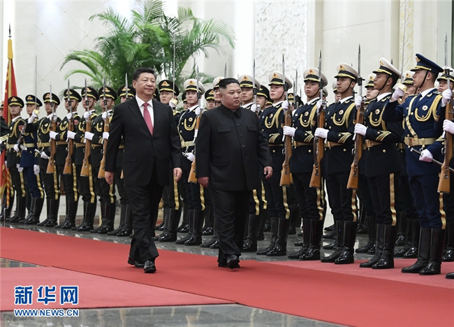1月8日,中共中央總書記、國家主席習近平同當日抵京的朝鮮勞動黨委員長、國務委員會委員長金正恩舉行會談。會談前,習近平在人民大會堂北大廳為金正恩舉行歡迎儀式。 新華社記者 李學仁 攝