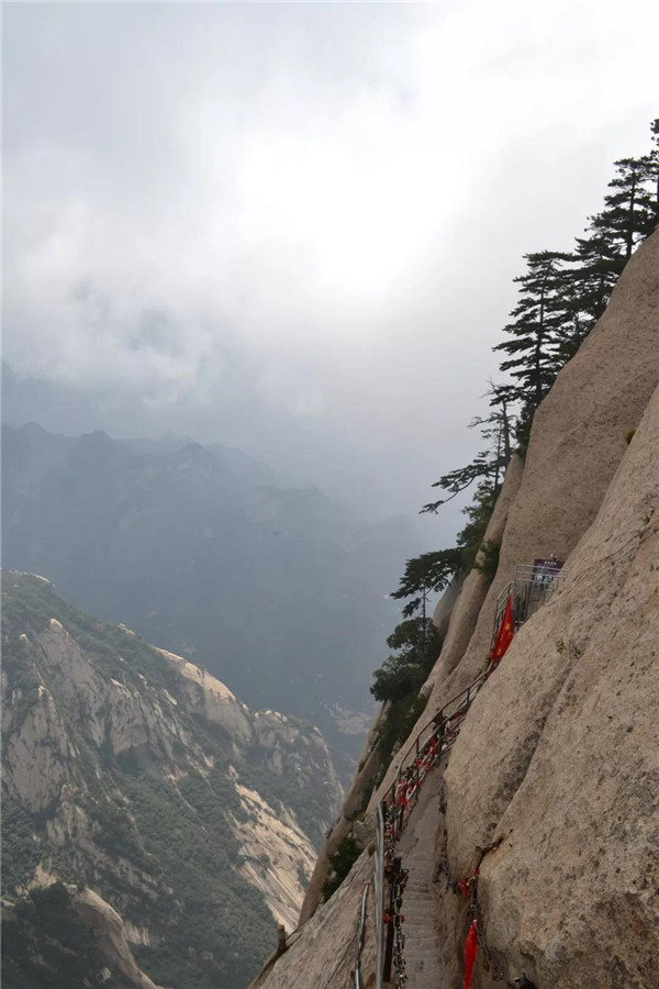 面向西峰方向,左側是斧劈般的絕壁,右側是坡度陡峭的山嶺。山脊兩側豎有結實的鐵柱,以腕粗的鐵鏈相連續(xù)。膽小的人屏住呼吸,緊抓鐵鏈前行;膽大的年輕人,不抓鐵鏈,走在中間,總讓人擔心他會滑跌!腳下的山脊有一定坡度,并不能踩平實,就像走在傾斜的平衡木上。緊窄處,上山下山的人需錯身通行。華山之險,讓我們刻骨銘心!