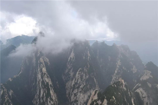 現(xiàn)在爬華山可不是“自古華山一條道”了,我們選擇坐西峰索道纜車,凌空飛渡千山萬壑。說是千山萬壑,其實華山是由一塊完整碩大的花崗巖石體構成的?!渡胶=?jīng)》記載:“太華之山,削成而四方,其高五千仞,其廣十里。”真的很難想像,這么連綿起伏、巨大的山體,其實是一個群峰競秀的整體。華山,就是這么神奇!