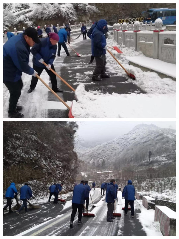 1月31日凌晨景區(qū)出現(xiàn)強降雪天氣,道路積雪嚴重影響行車安全。華旅集團第一時間多渠道發(fā)布景區(qū)推遲運營時間的信息,并向游客做好解釋工作,同時號召集團各部室、各單位迅速組織人員赴進山公路進行掃雪除冰,經(jīng)過三個小時的全力清掃,東線進山公路積雪清理完畢,景區(qū)在短時間內(nèi)恢復運營,西線索道進山公路及華山峪區(qū)域不斷加大清掃力度,盡力實現(xiàn)景區(qū)全線貫通。
