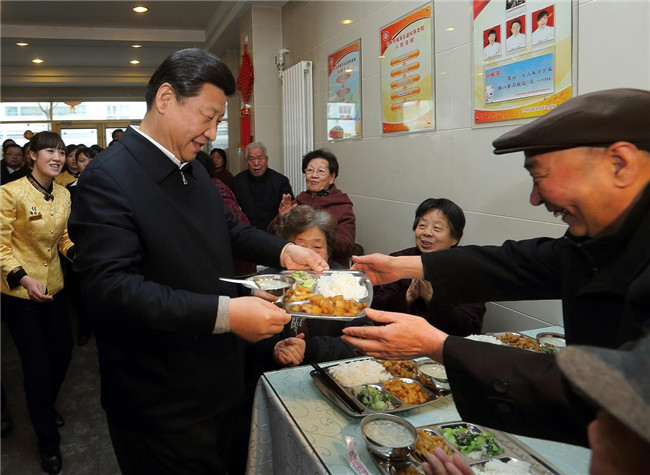 2013年2月4日,習(xí)近平來(lái)到蘭州一家“虛擬養(yǎng)老院”的養(yǎng)老餐廳,了解有關(guān)情況,還端起一個(gè)盛滿飯菜的餐盤(pán),走到72歲的老人楊林太面前,輕輕送上,請(qǐng)他用餐。