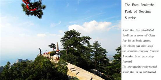 華山有五座主峰,從一定角度看就像一朵蓮花盛開(kāi)在天際(中文的“花”),分別是東峰(朝陽(yáng)峰),中峰(玉女峰),西峰(蓮花峰),北峰(云臺(tái)峰)以及最高最險(xiǎn)的南峰。