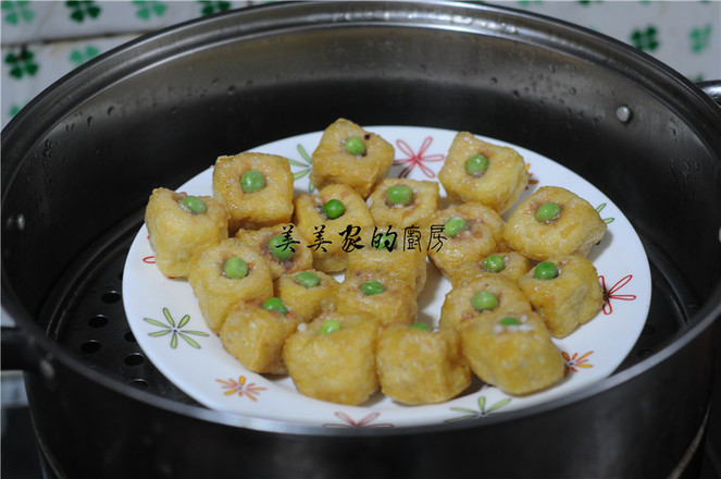 4.油豆腐表面用筷子撮一個(gè)洞,將拌好的餡慢慢塞入油豆腐里,盡量塞滿,在洞口上塞上一顆青豆裝飾。
