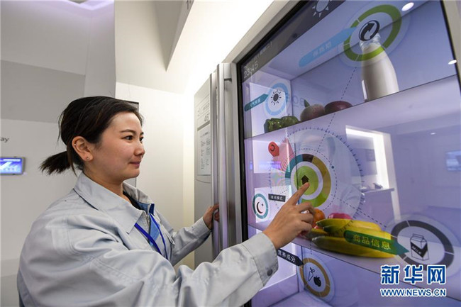 2月22日,在位于內(nèi)蒙古鄂爾多斯市東勝區(qū)的京東方鄂爾多斯AM——OLED顯示器項目中,工作人員在展示運用了透明顯示技術(shù)的智能冰箱。 新華社記者 彭源 攝