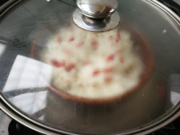 6.大火燒開(kāi)水,把排骨糯米蒸一小時(shí)左右,再撒入枸杞子,再燜蒸30分鐘