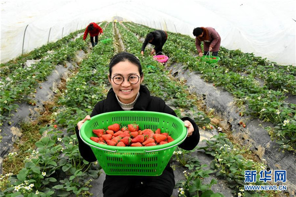 2018年2月27日,王萌萌展示剛采摘的草莓。全國人大代表王萌萌是安徽省定遠縣西孔村一名大學(xué)生“村官”,她帶領(lǐng)村民建立起草莓園、蔬菜園、育秧工廠等特色項目,吸引游客前來采摘,村民的日子越過越紅火。 新華社發(fā)(馮再雷 攝)