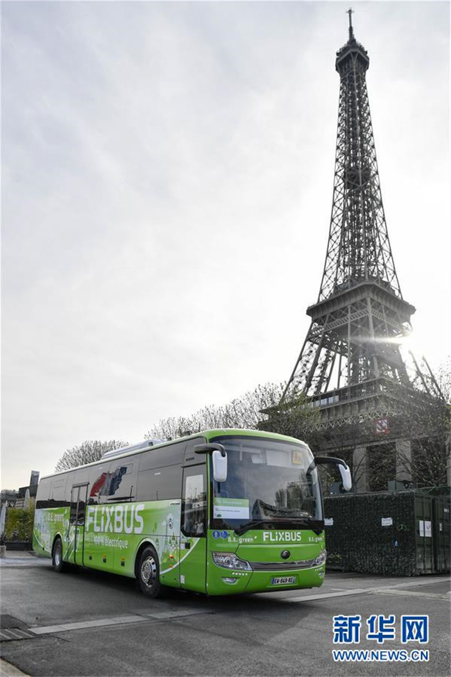 這是2018年4月10日在法國巴黎拍攝的中國宇通電動客車。這輛59座電動客車在法國巴黎至亞眠的城市間長途客運線路上運營。 新華社記者 陳益宸 攝