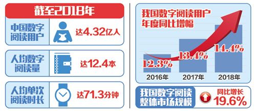 4月12日至14日,第五屆中國數(shù)字閱讀大會在杭州召開。會上發(fā)布的《2018年度中國數(shù)字閱讀白皮書》顯示,截至2018年,中國數(shù)字閱讀用戶總量達到4.32億,人均數(shù)字閱讀量達到12.4本,人均單次閱讀時長達71.3分鐘。我國數(shù)字閱讀整體市場規(guī)模已達到254.5億元,同比增長19.6%,大眾閱讀市場規(guī)模占比逾九成,是產(chǎn)業(yè)發(fā)展主導力量。