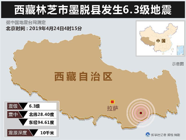4月24日4時15分,在西藏林芝市墨脫縣(北緯28.40度,東經(jīng)94.61度)發(fā)生6.3級地震,震源深度10千米。林芝消防力量已趕赴震中應(yīng)急處置,向當?shù)亓私獾那闆r顯示,中心區(qū)域震感強烈。(記者葉昊鳴)