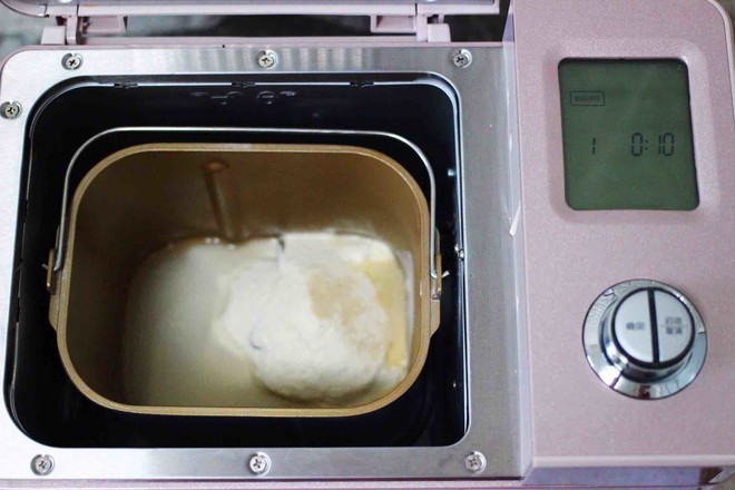 2.把稱重的面粉和清水,放入東菱面包機(jī)里,加入酵母后,啟動和面模式。