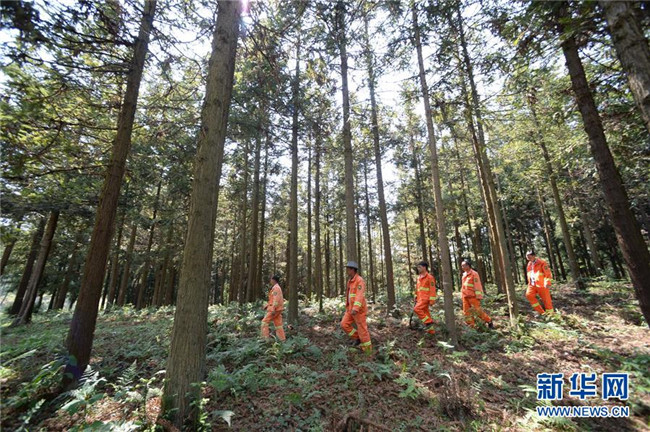 4月27日,在貴州省畢節(jié)市赫章縣平山國(guó)有林場(chǎng),李瓊江(右一)、李健(右三)和林場(chǎng)職工在護(hù)林途中。 新華社記者 楊楹 攝